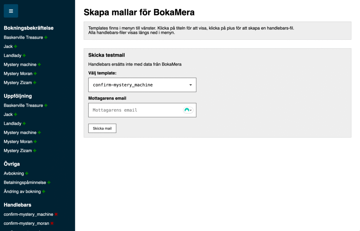 För att uppnå detta så har jag byggt ett eget administrations-gränssnitt som skapar mallarna med nycklar (handlebars) för bokarens uppgifter, såsom namn, datum, tid, plats etc. Men också unika uppgifter för respektive spel, som tex åldersgräns, speltid, bild och adress.