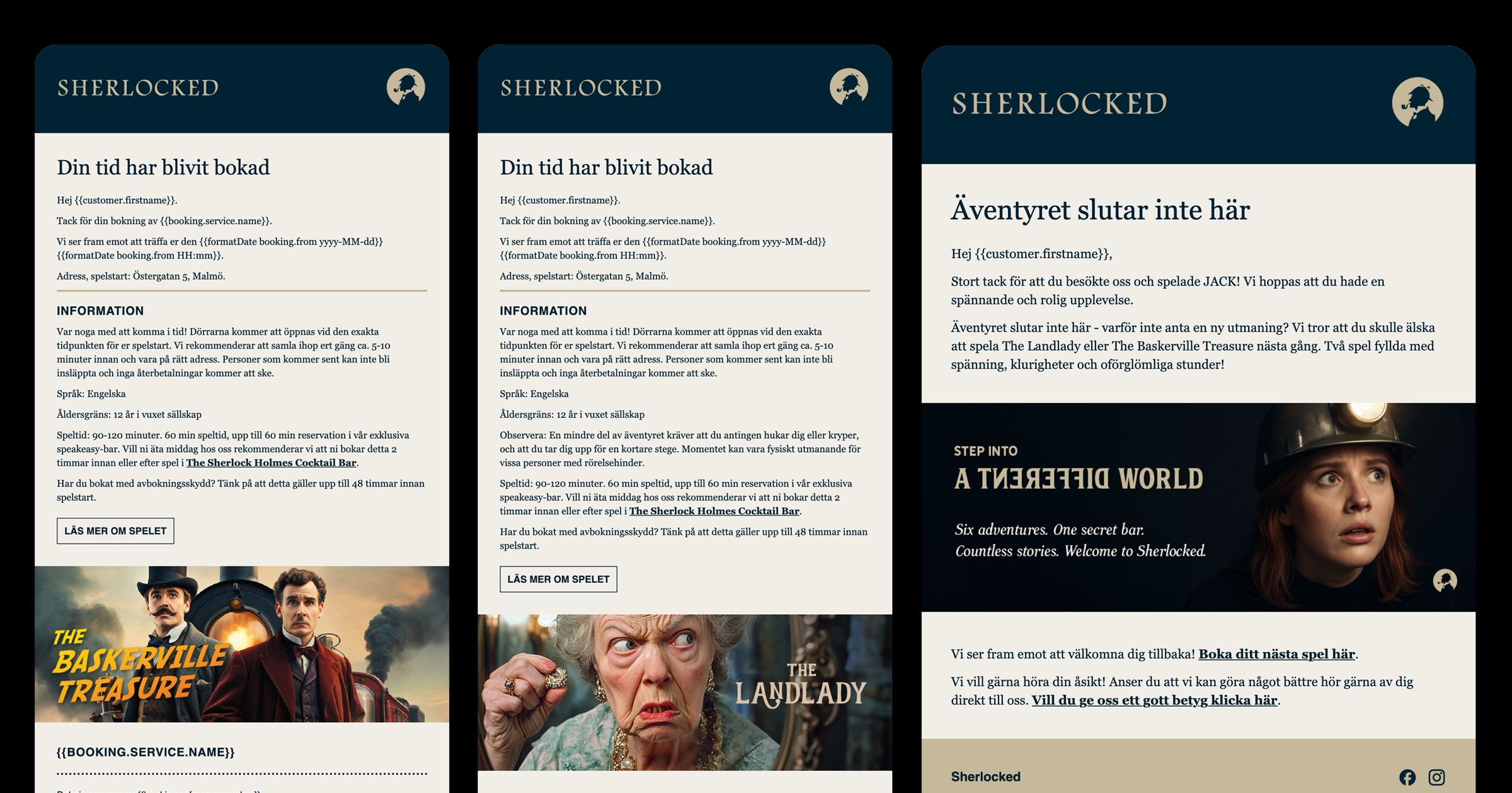 Jag har byggt mail-mallar för systemet BokaMera åt Sherlocked designade av Daniel Zachrisson, så att känslan av att besöka Sherlocked genomsyrar även bokningsprocessen.