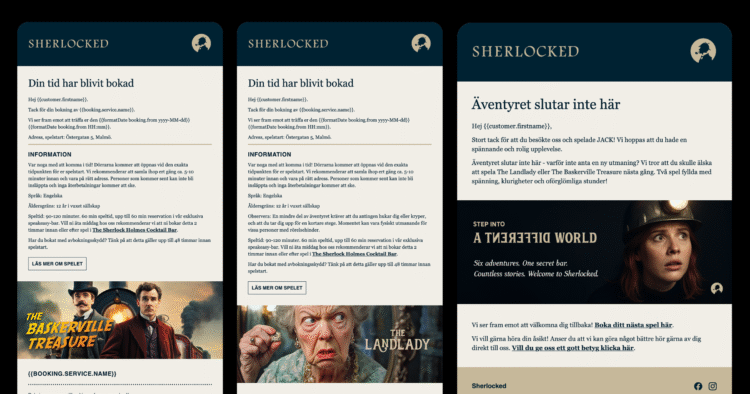 Trevliga mail från Sherlocked 10 november, 202511 november, 2025 Jag har byggt mail-mallar för systemet BokaMera åt Sherlocked designade av Daniel Zachrisson, så att känslan av att besöka Sherlocked genomsyrar även bokningsprocessen. För att uppnå detta så har jag ...